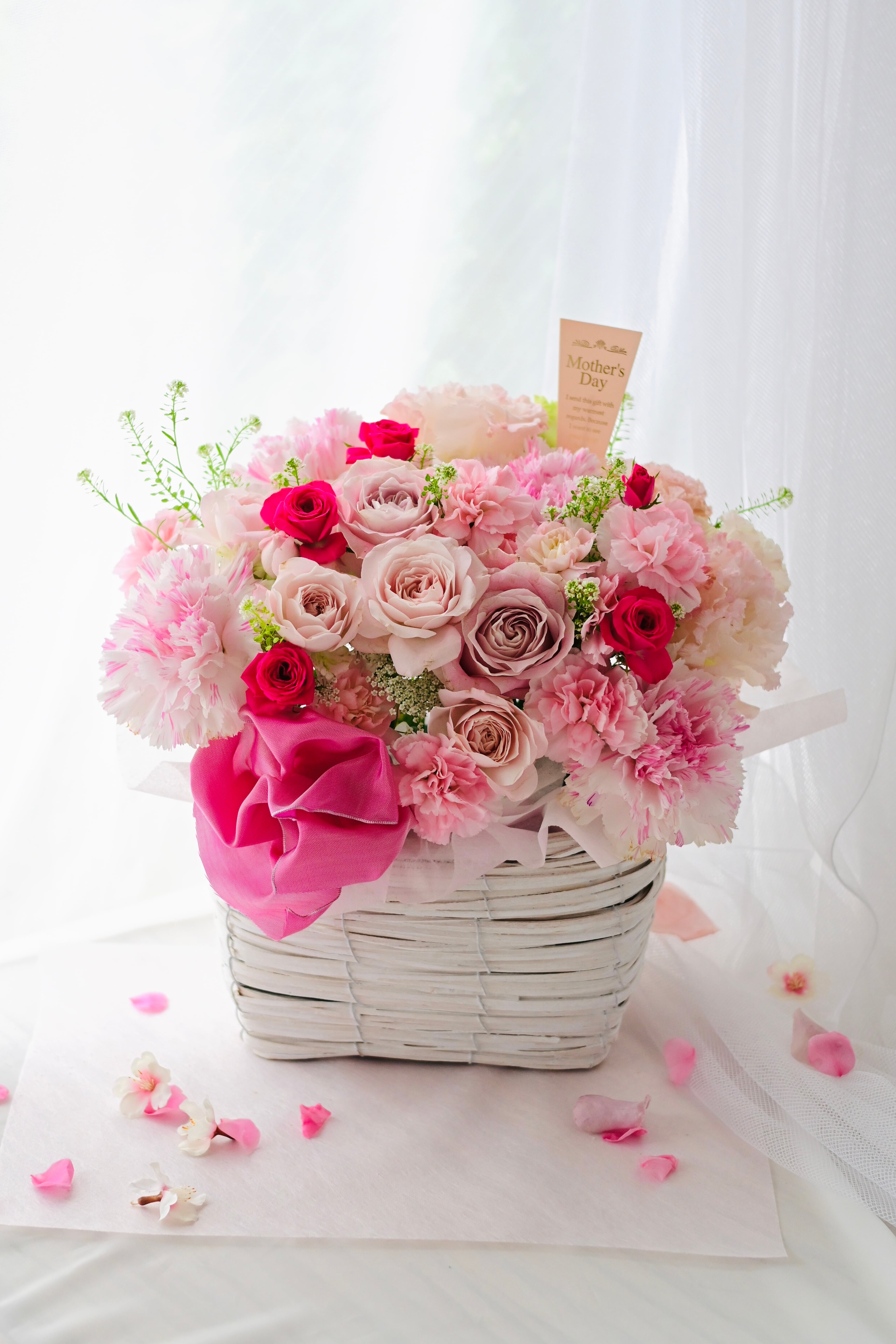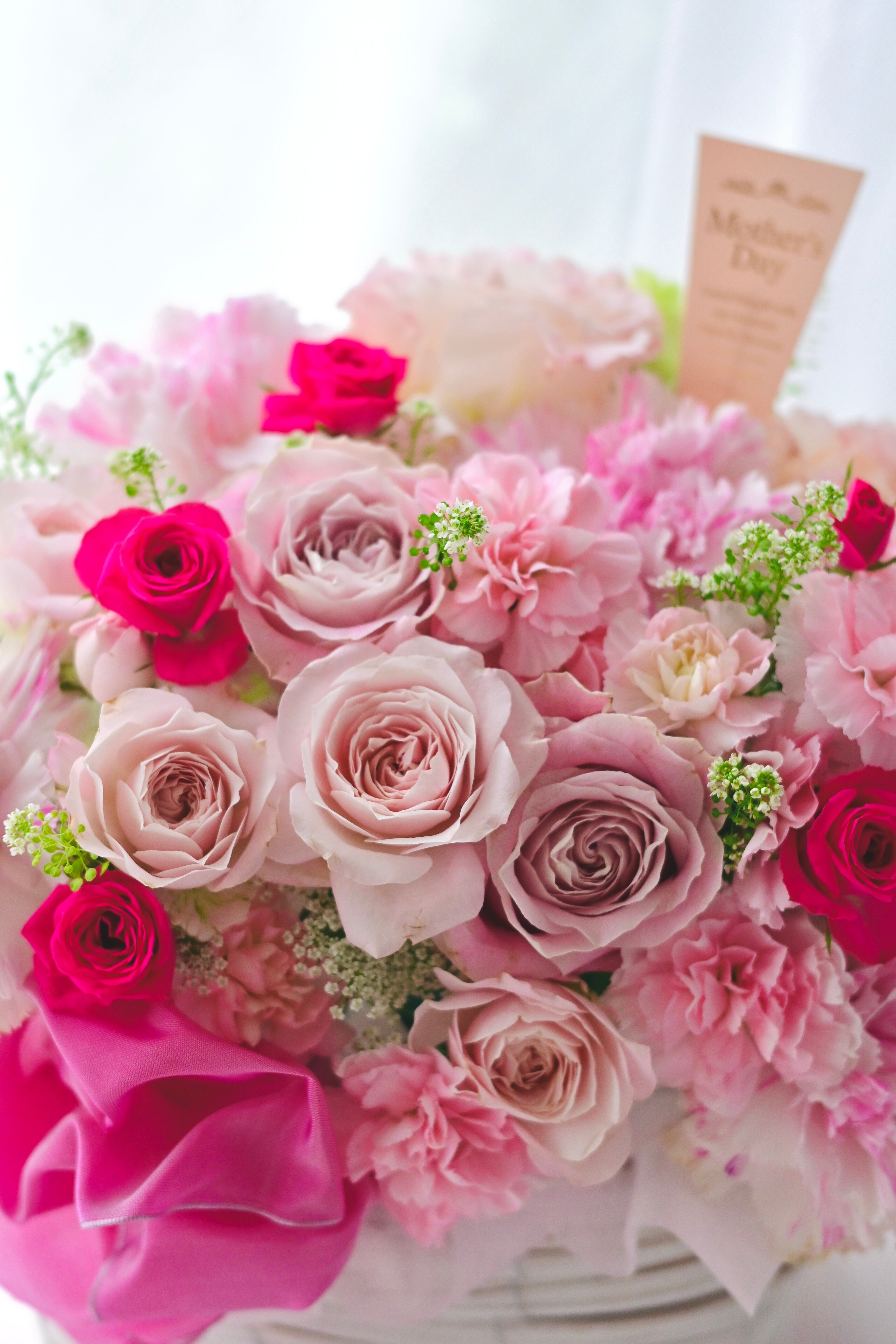 優しいピンクのカーネーションやバラの生花を使った、心温まる花たちです。